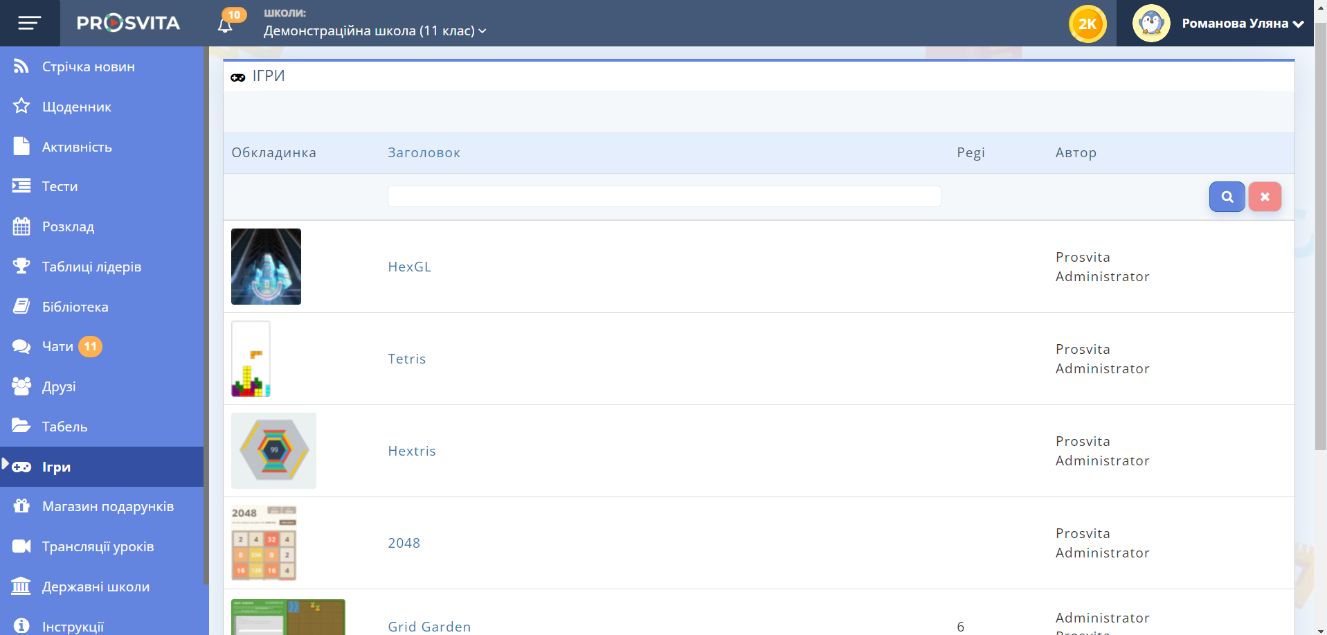 У розділі "Ігри" можна зіграти в такі комп'ютерні браузерні ігри: