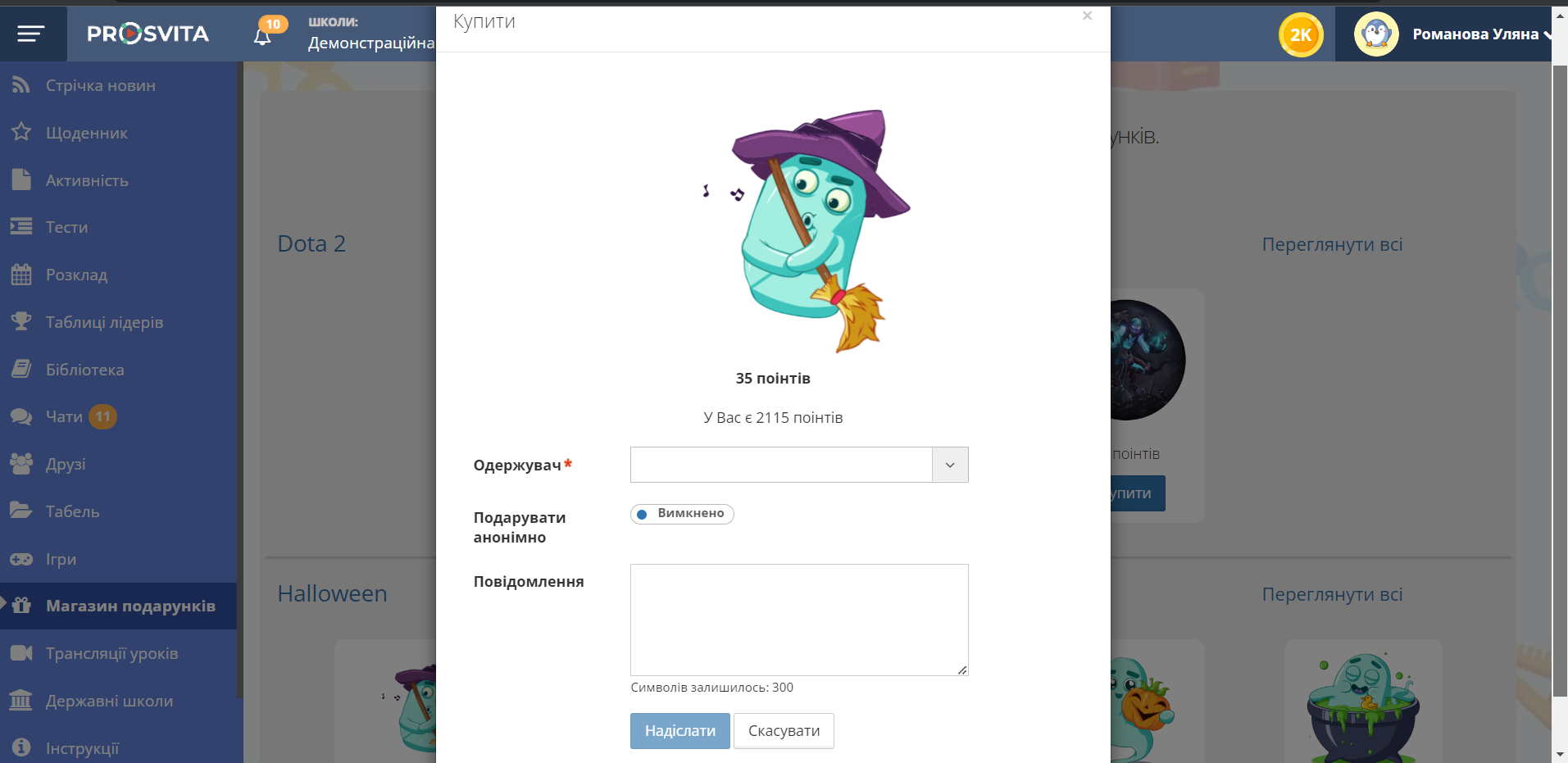 Натисніть кнопку "Надіслати". Подарунок з’явиться у розділі "Стрічка новин" одержувача подарунка.