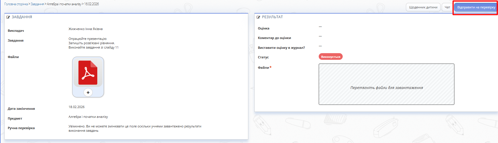 Після виконання тесту та завантаження файлів з домашнім завданням, натисніть кнопку "Відправити на перевірку". Статус завдання зміниться з "Виконується" на "Очікує перевірки".