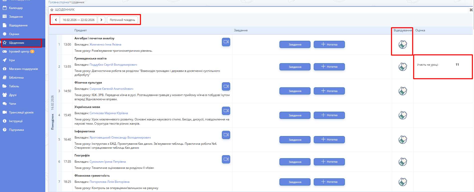 Перейдіть на сторінку "Щоденник". Тут ви знайдете колонку з розкладом на поточний тиждень, до якої додаються колонки з домашнім завданням, відвідуванням та оцінками.