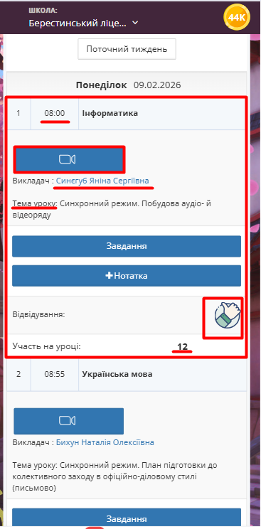 - можливість почати онлайн чат з викладачем (натиснувши на прізвище вчителя в рядку "Викладач").
