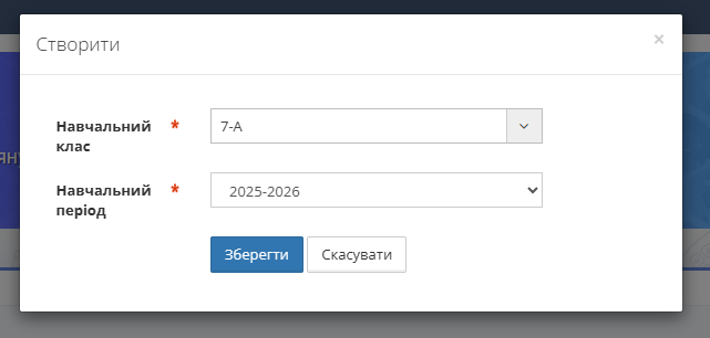 У вікні, що відкриється, оберіть зі списку потрібний навчальний клас і навчальний період, потім натисніть «Зберегти».
