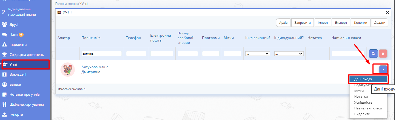 - У меню зліва перейдіть до розділу «Учні» та знайдіть потрібного учня за списком або за допомогою пошуку.