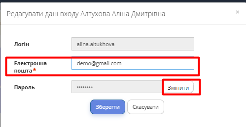 Fig. 2 — Зміна електронної пошти учня - Якщо потрібно змінити пароль, натисніть кнопку "Змінити" біля поля "Пароль". Система автоматично змінить пароль. Пароль буде скопійовано у буфер обміну.