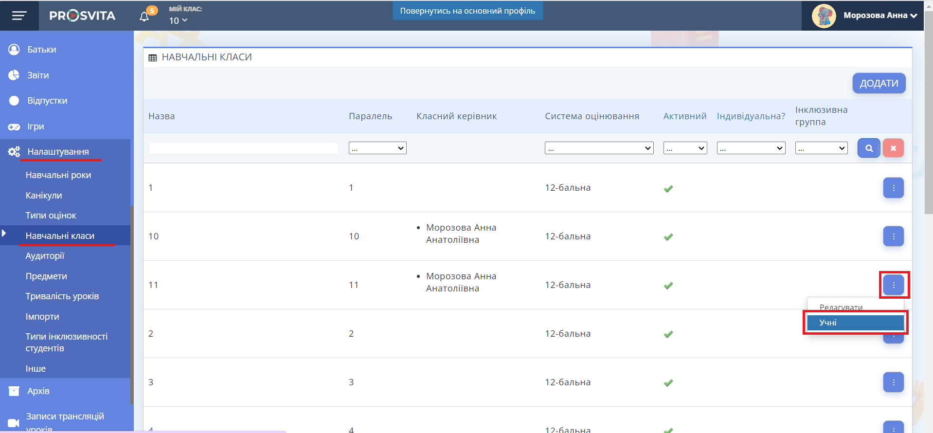 Рис. 4 — Список учнів і кнопка "Навчальні класи" - У списку знайдіть головний клас.