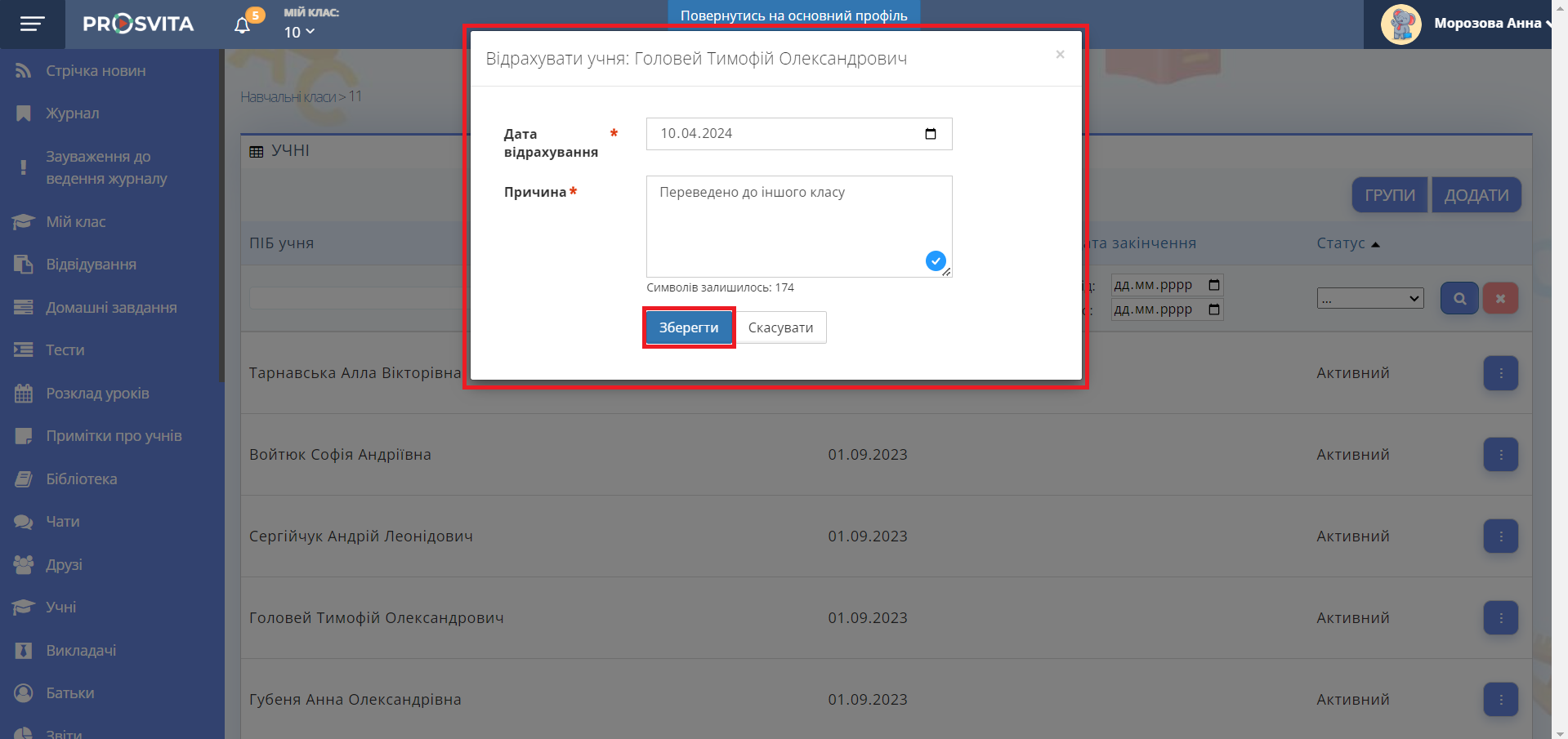 Рис. 5 — Кнопка "Відрахувати" - У вікні вкажіть дату та причину (як на рис. 3).
