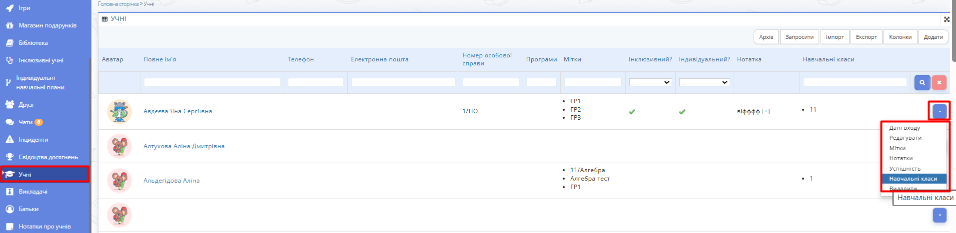- Натисніть кнопку контекстного меню праворуч від класу та оберіть Учні.
