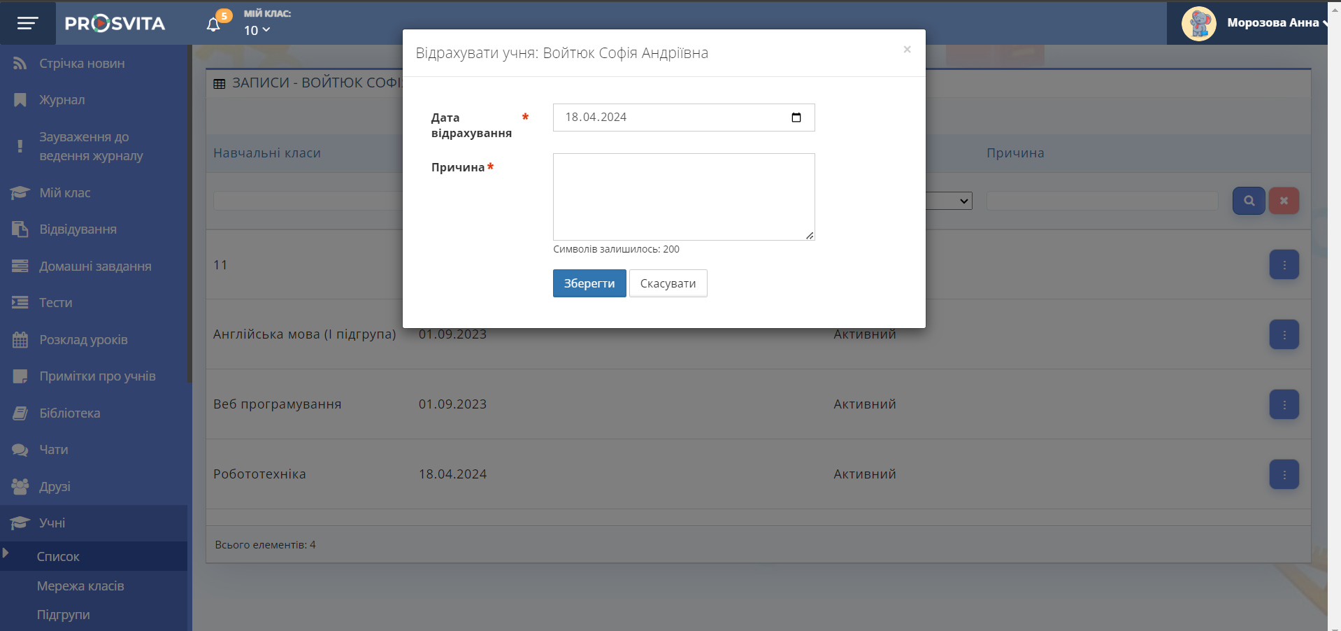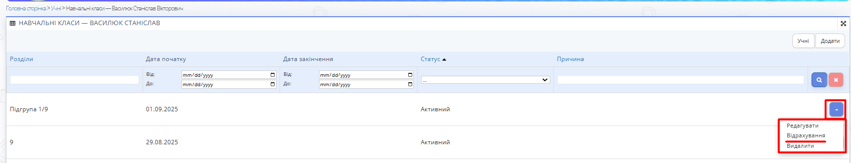 Рис. 5 — Кнопка "Відрахувати" - У вікні вкажіть дату та причину (як на рис. 3).
