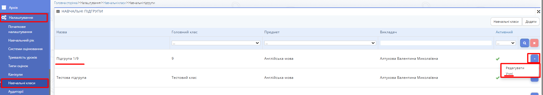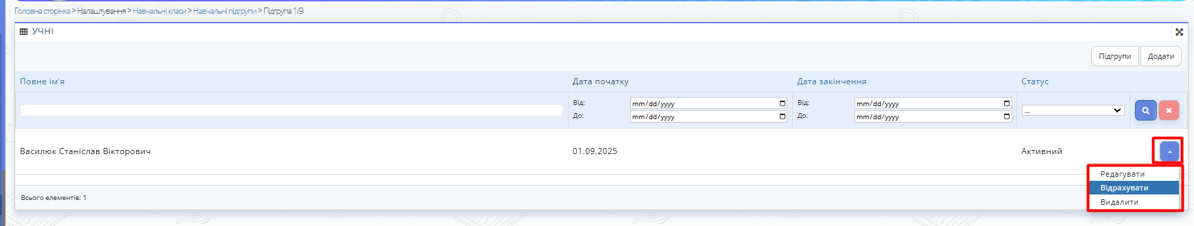 - Біля потрібної підгрупи натисніть кнопку контекстного меню праворуч та оберіть Учні.