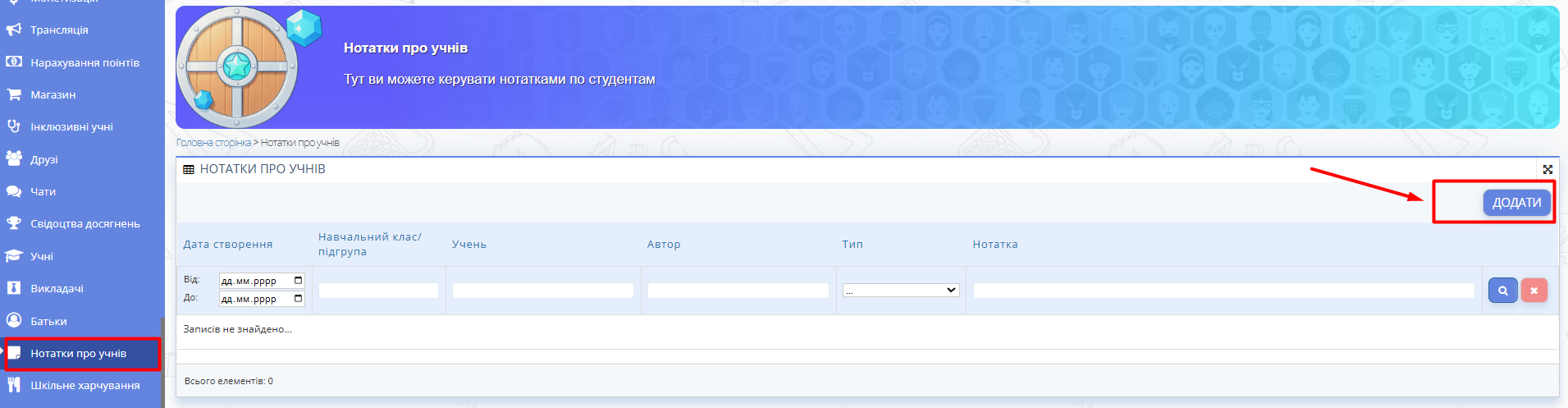 Перейдіть до розділу “Нотатки про учнів” у головному меню.