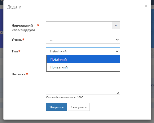 Розділ “Нотатки про учнів” призначений для збереження та керування коментарями щодо окремих учнів. Нотатки можуть бути Приватними або Публічними залежно від мети та рівня доступу.