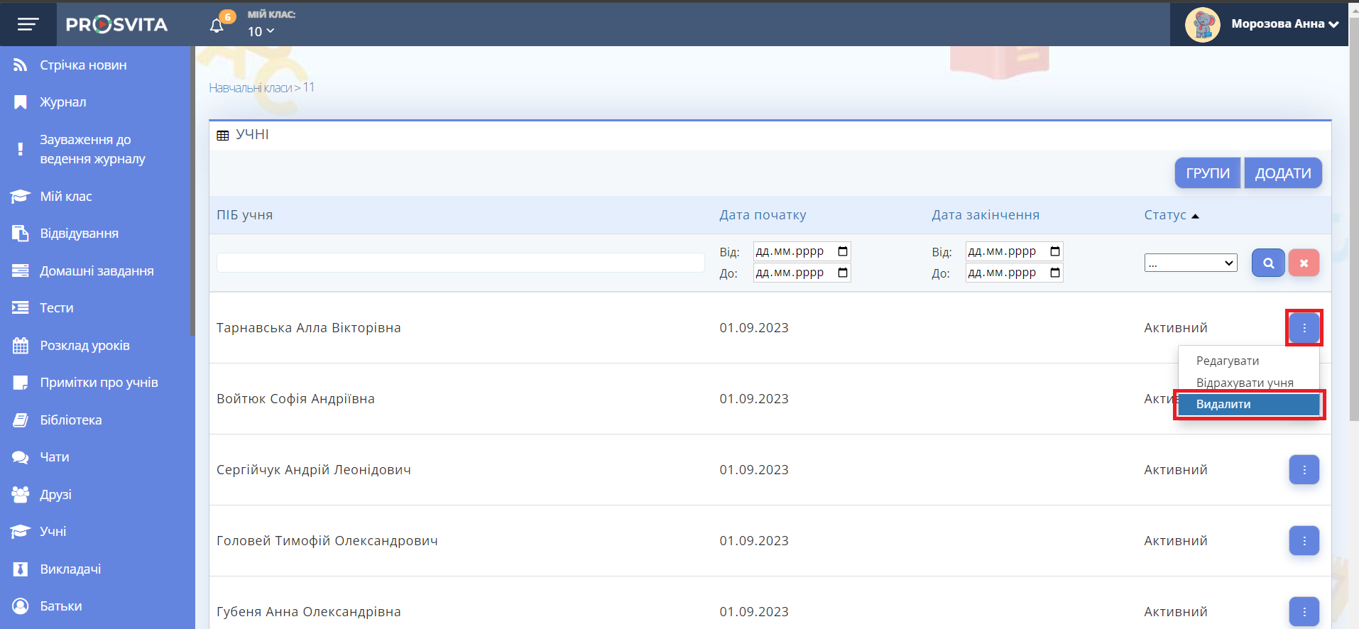 ⚠️ Після видалення учня вся інформація про нього зникне з журналу класу та підгруп.